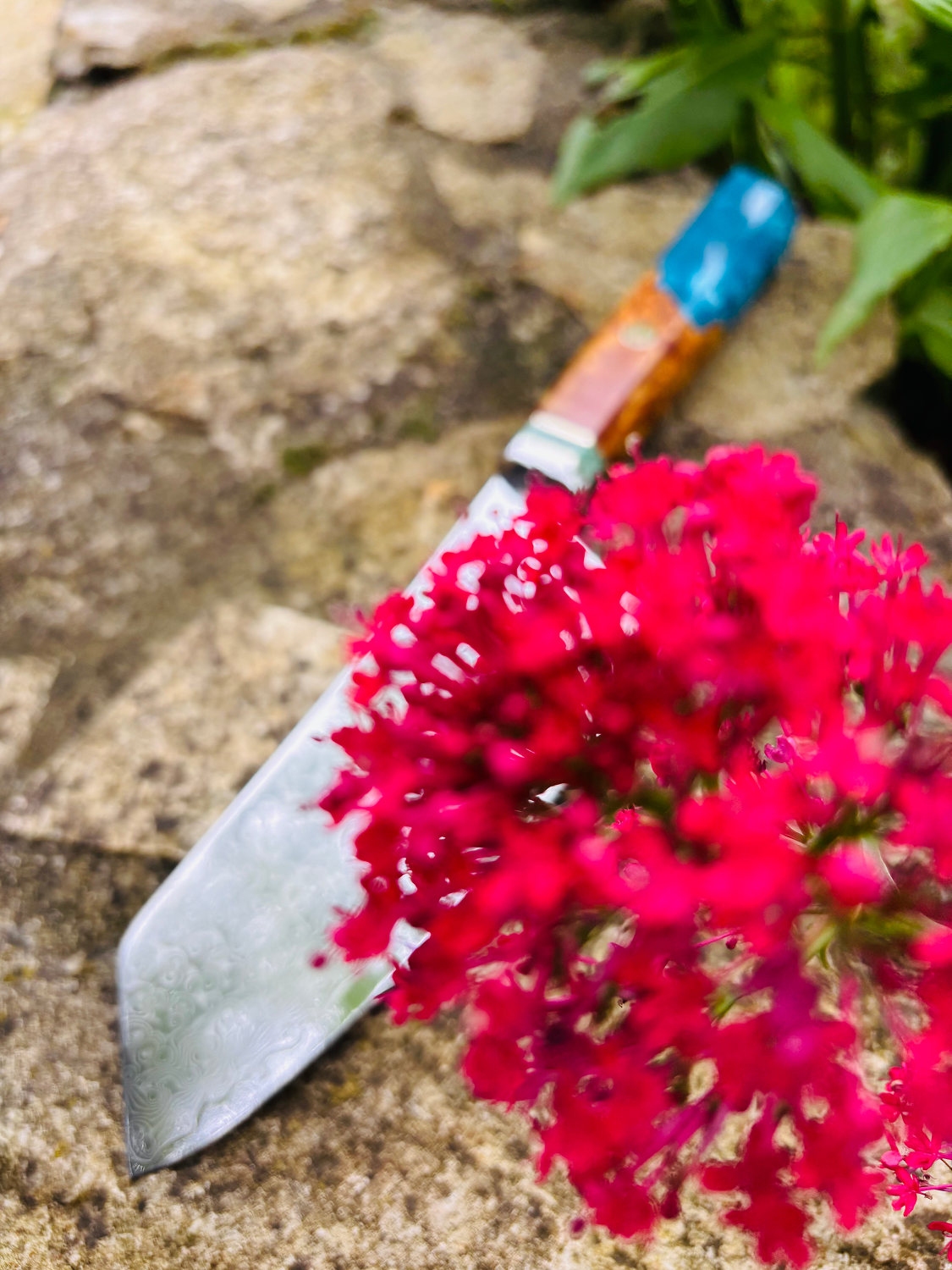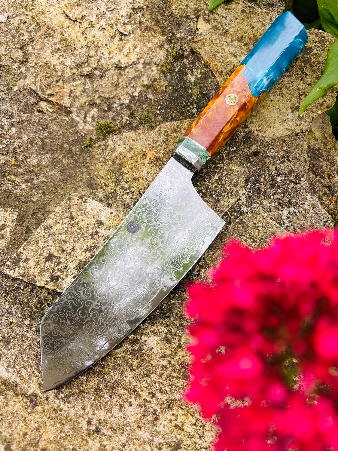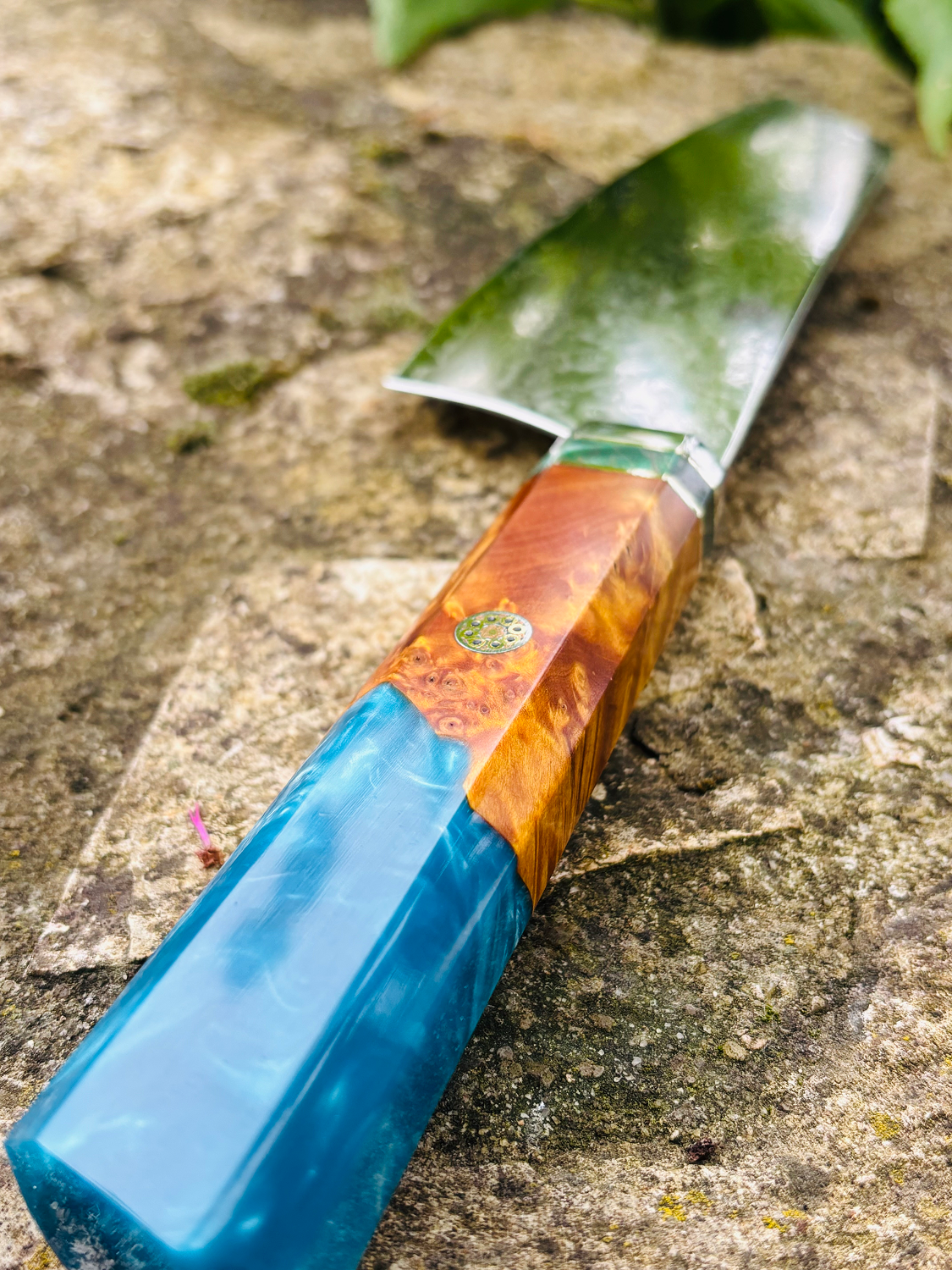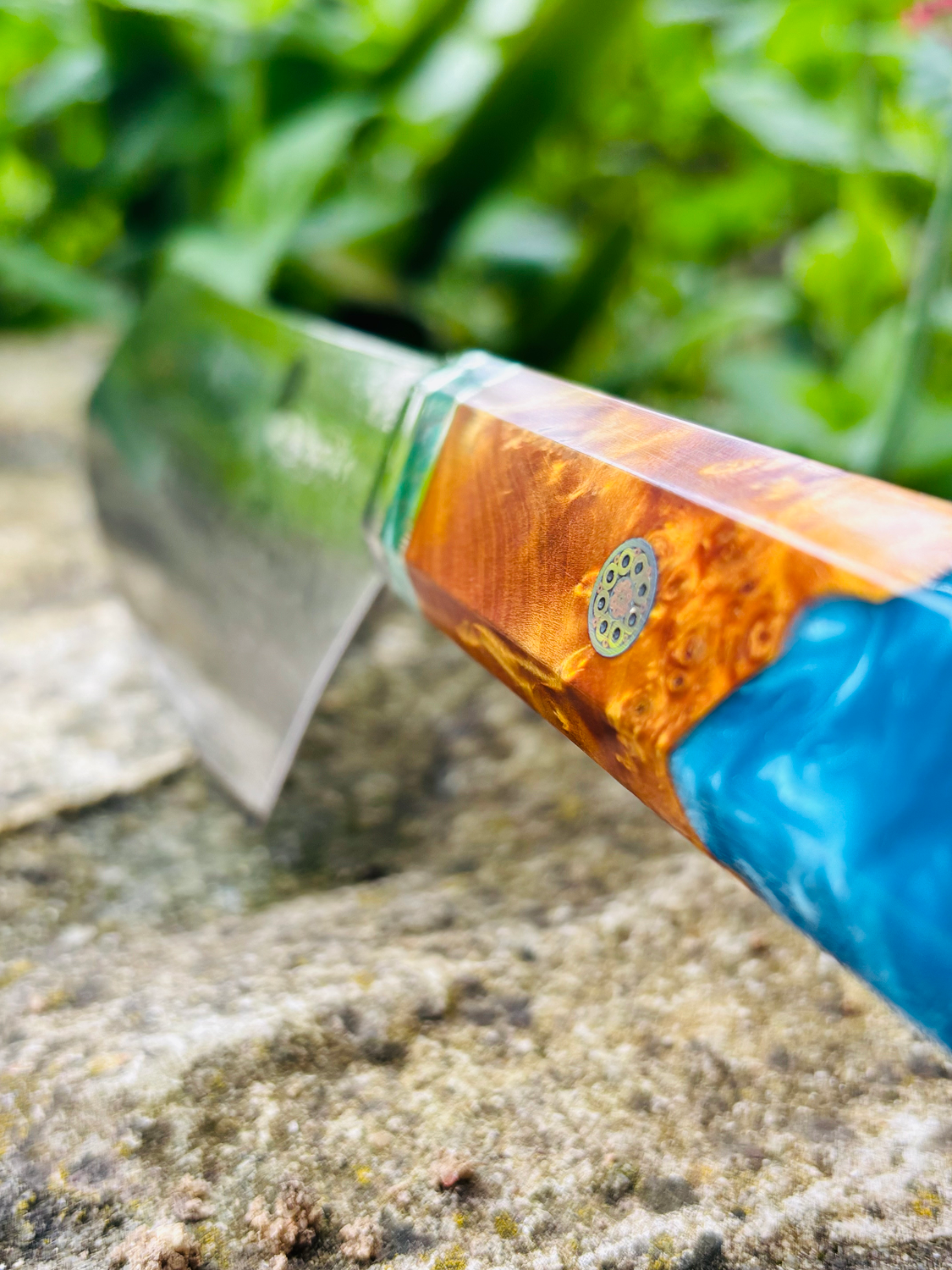 • Handle: Burl maple wood with blue composite resin, providing durability and comfort.
