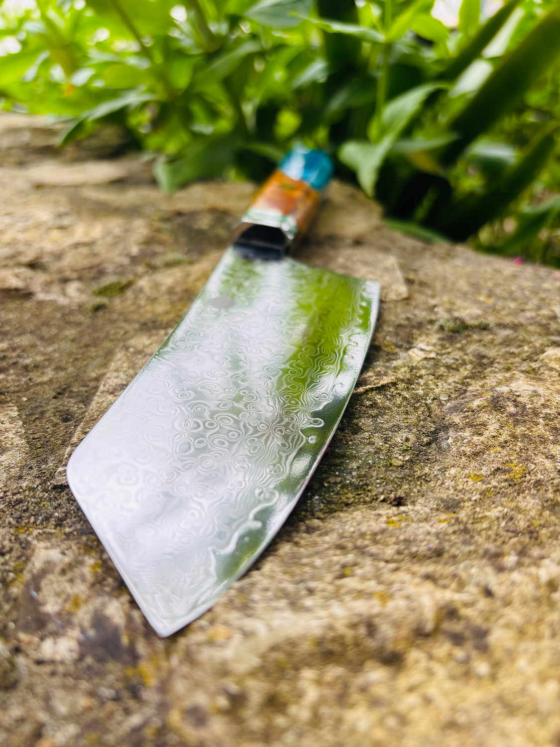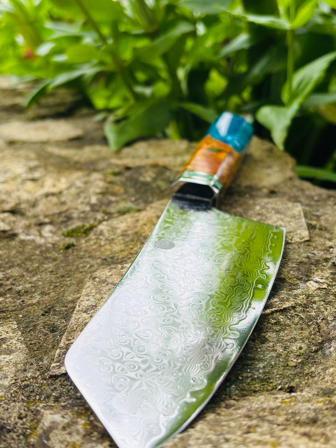 Cleaver with a 67-layer VG10 Damascus steel blade and 60 +/-2 HRC hardness. Handle made of blue burl maple wood with composite resin, combining aesthetics and ergonomics. Durable, extra sharp, and designed for right-hand use. Packaged in a gift box with a logo personalization option.