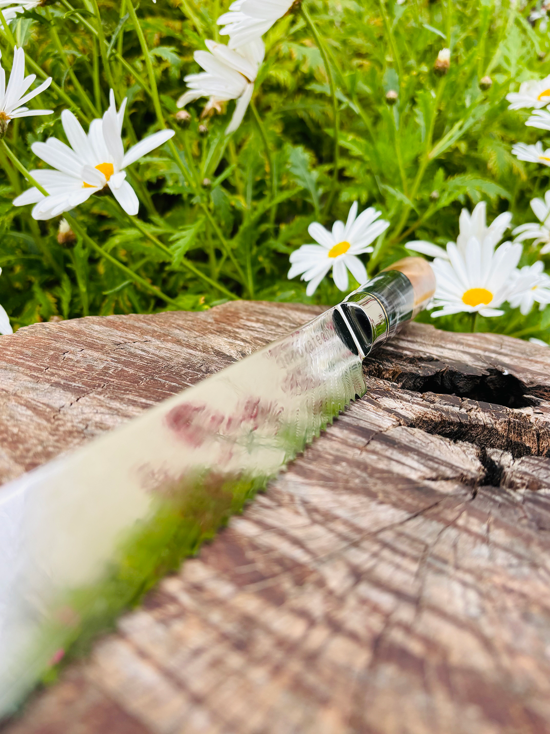 • Handle: Composite resin and maple burl wood.