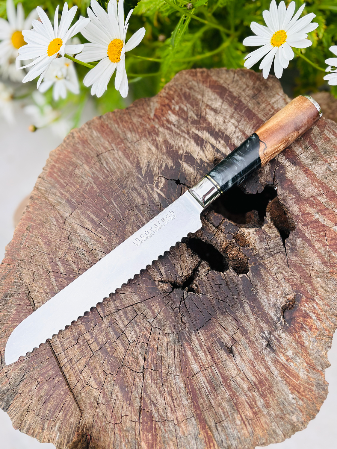 Bread knife with a 67-layer VG10 Damascus steel blade (60 +/-2 HRC) and a 2.5 mm thickness. Features a composite resin and maple burl wood handle for durability and comfort. Ideal for slicing bread and other soft foods. Comes with a gift box and logo personalization option.