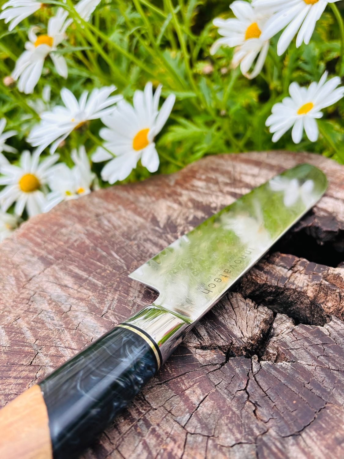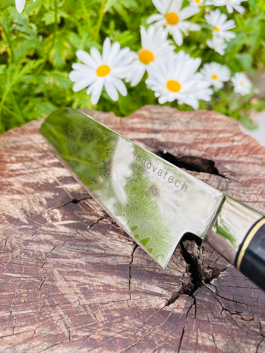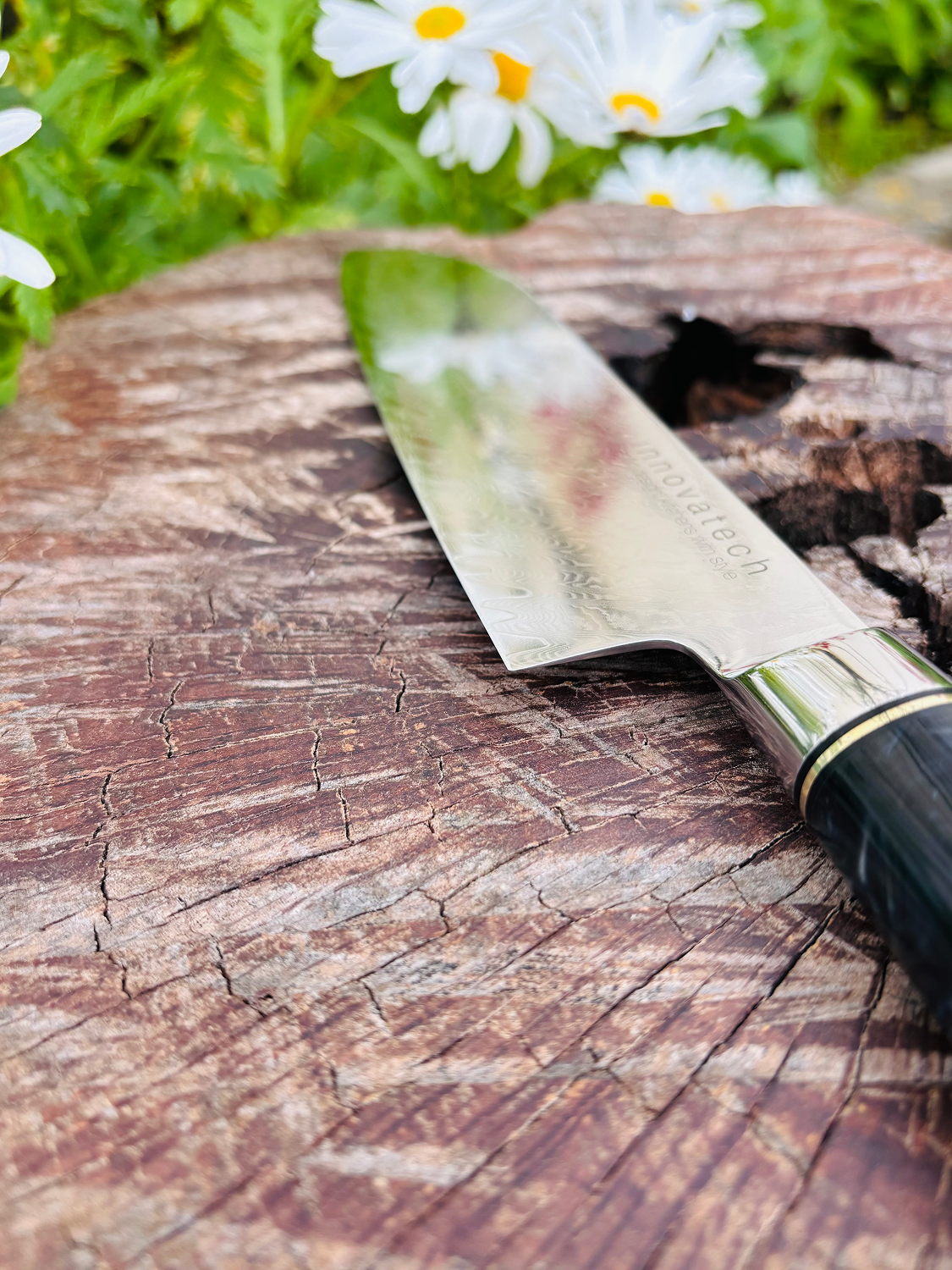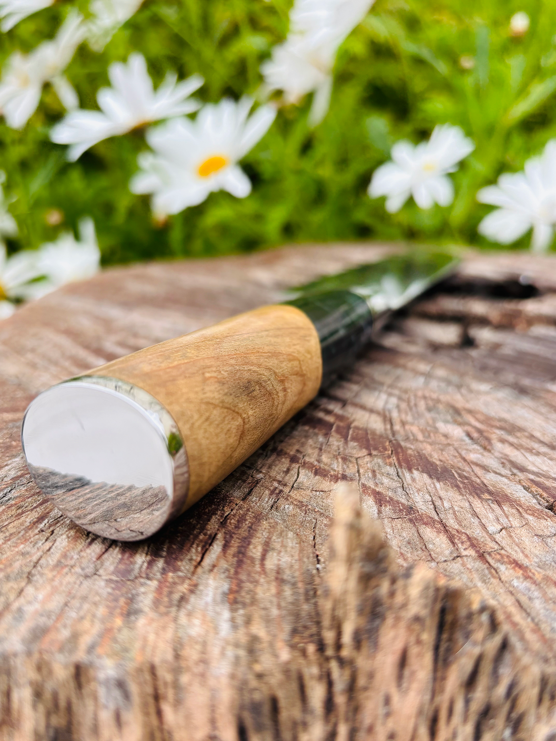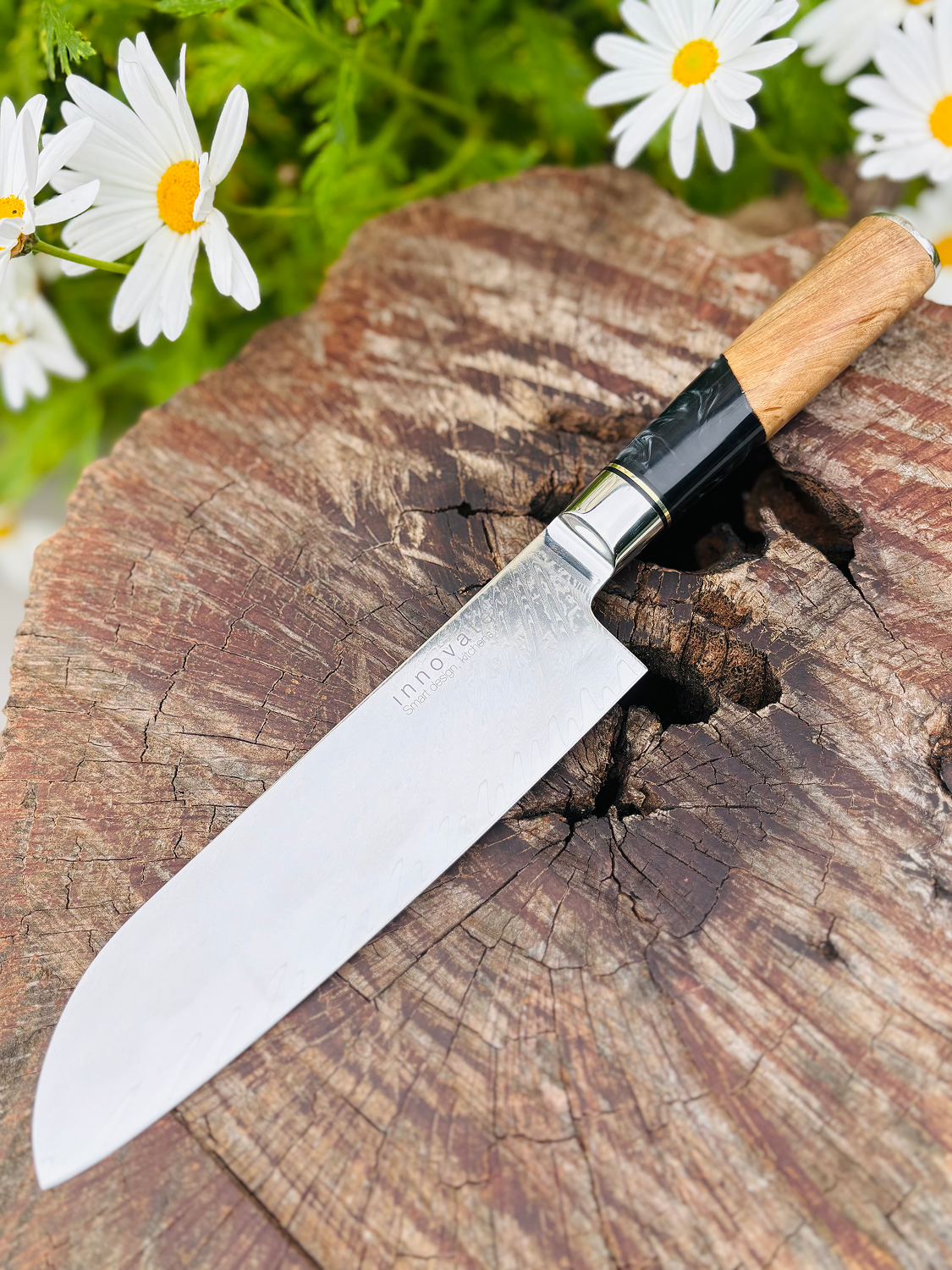 Santoku Knife with a 67-layer VG10 Damascus steel blade (60 +/-2 HRC) and a 2.5 mm thickness. Designed with a composite resin and maple burl wood handle for durability and comfort. Ideal for precision chopping and slicing tasks. Comes with a gift box and logo personalization option.